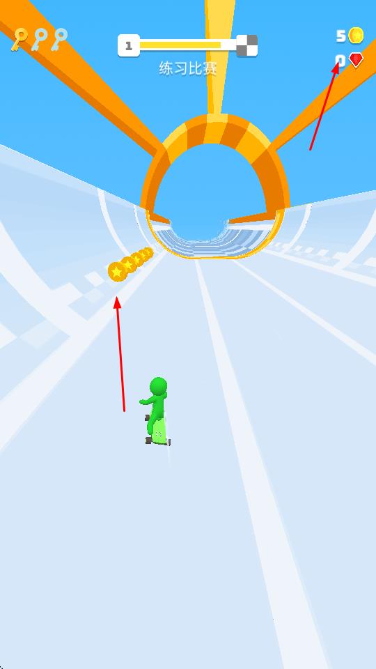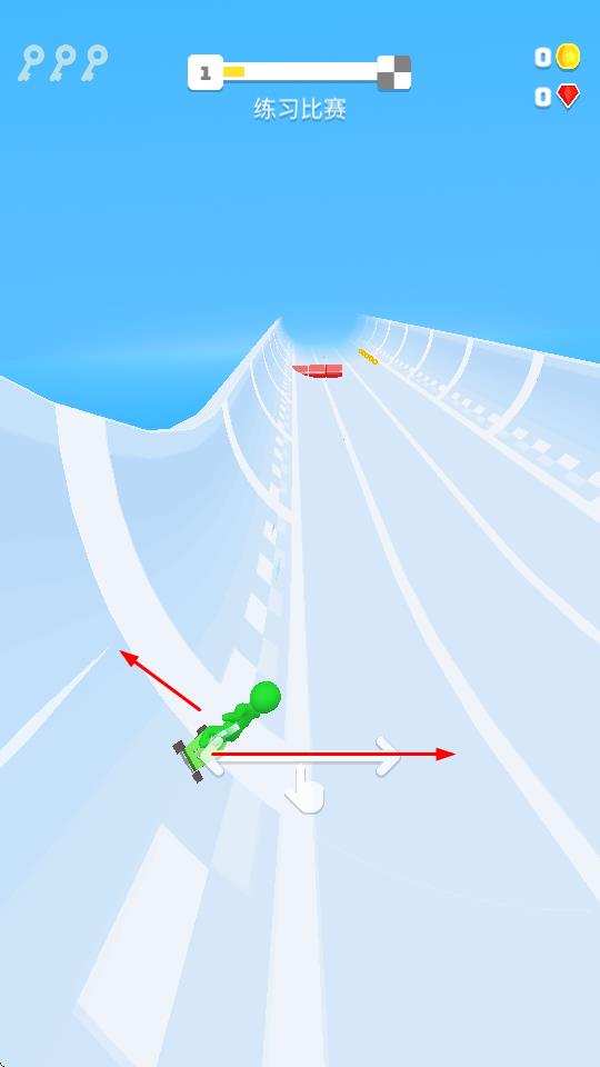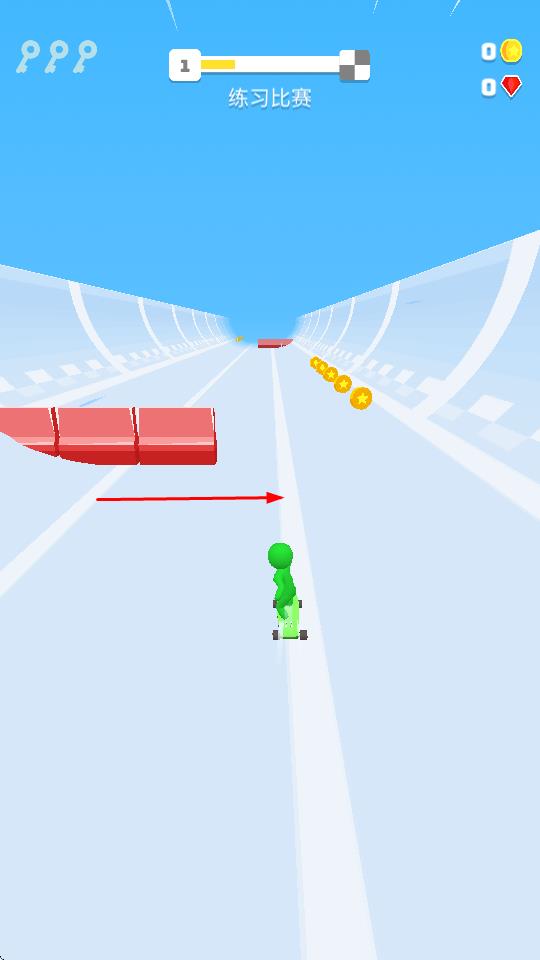 1、“滑板跑酷”,操控绿色小人在“练习比赛”模式下,沿未来感跑道滑板前进,跟随红色箭头指引。