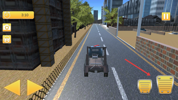 2、驾驶时,用左侧箭头、右侧黄色按键控车,沿城市道路行驶,留意时间与任务指引。