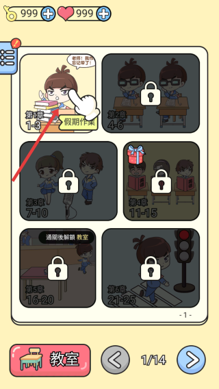 1、关卡选择:在教室场景选章节(如第1章1-6关),进入对应关卡。