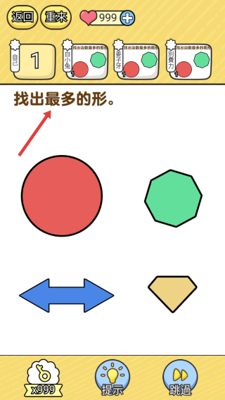 2、题目挑战:第1题“找出最多的形”,观察图形数量,点击数量最多的图形(红色圆形)。