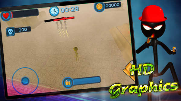 2、鲜明角色与画面:以火柴人为角色主体,有不同颜色区分,部分火柴人(如BOSS)体型更大,辨识度高;画面采用卡通背景,清晰明快,类似动画片的视觉风格。