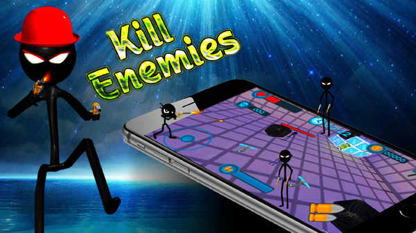 2、进入关卡后,操控虚拟摇杆(左侧蓝色圆圈),移动火柴人,在房间内探索,收集武器(如飞镖)。