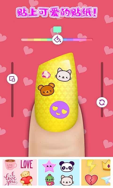 1、创意设计:高度自由的美甲创作与个性化定制,支持多维度色彩选择与图案组合,不同搭配方案产生独特视觉效果,每次挑战都是创意与审美的双重考验。