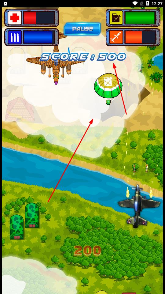 3、在战斗区域,操控战机击毁敌机并躲避攻击,朝着胜利目标努力,同时留意道具掉落,合理规划每一次出击。