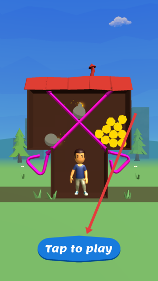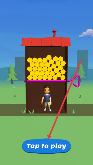 1、点击【Tap-to-play】,开始游戏,观察黄色金币布局,按箭头指引,拉取粉色拉针,让金币掉落,不砸到角色。