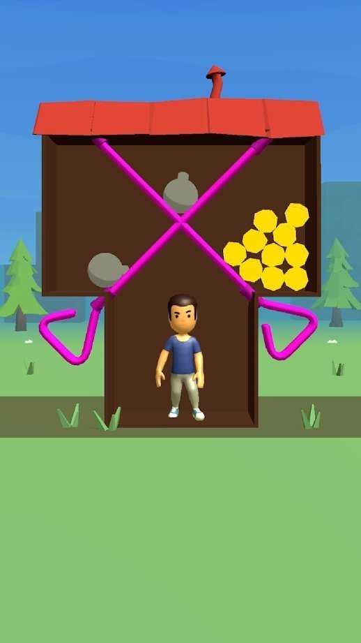 1、判断与操作结合:观察关卡中的钢筋布局、金币位置及危险元素(炸弹、熔浆等),思考并判断应先拔出哪根钢筋,再通过手指操作执行,答案正确获得黄金。