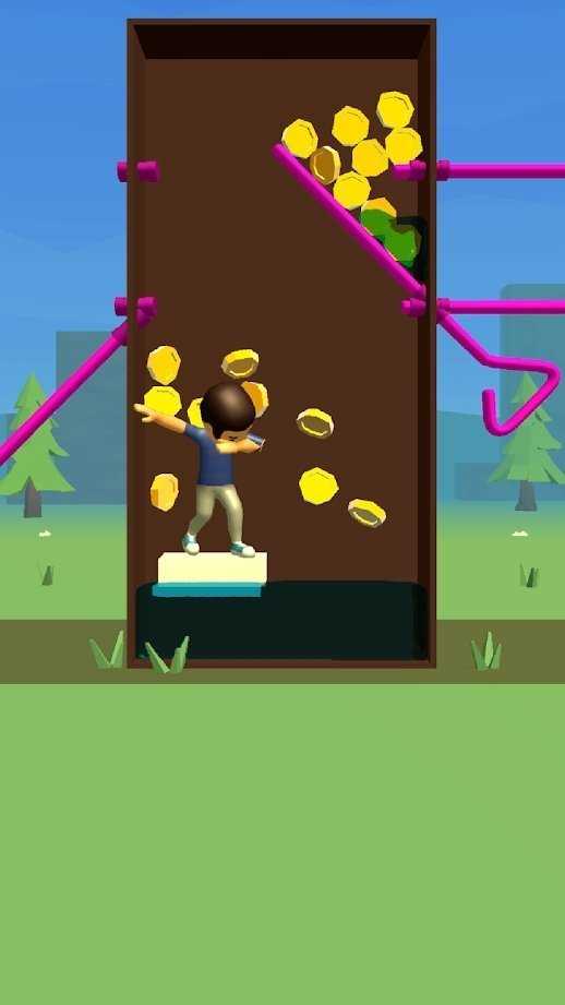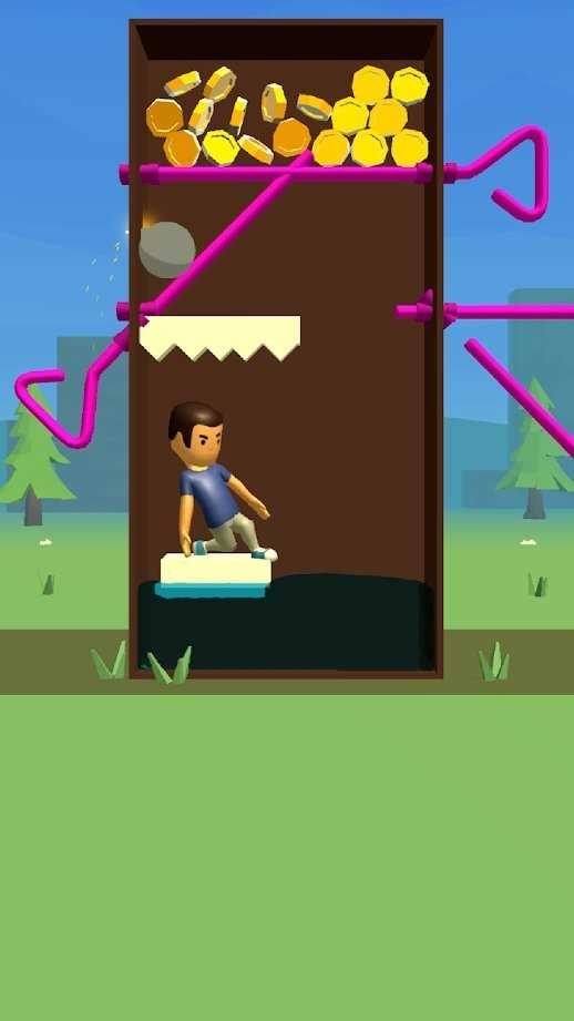 2、拉针后,金币下落,需避开角色,若失败可重开,成功后进入新关卡,继续拉针解谜,获取金币。