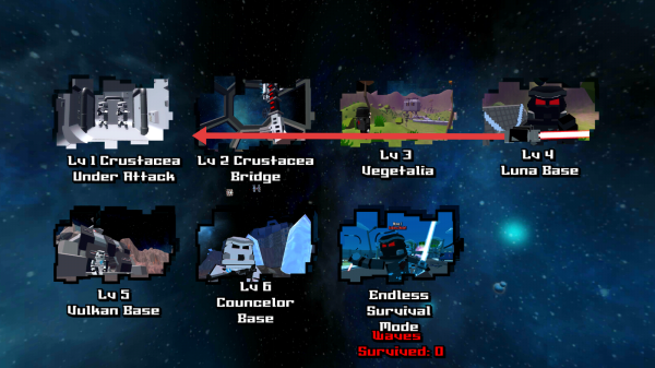 2、在关卡列表,选“Lv1-Crustacea-Under-Attack”,点击进入首关,操控银河骑士,开始太空冒险。