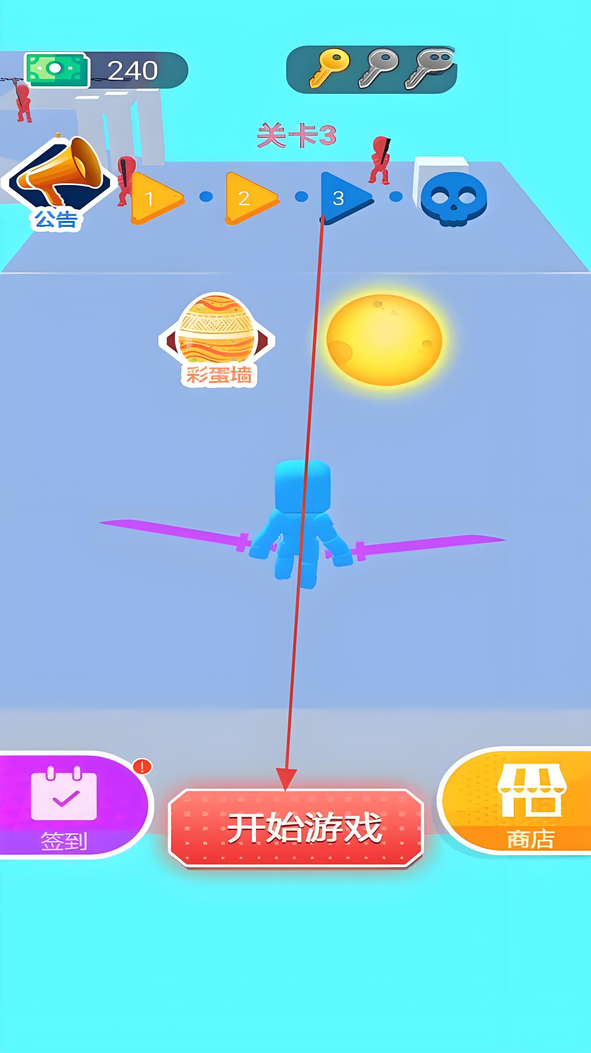 1、进入游戏后,可通过“签到”功能获取奖励,点击“开始游戏”进入关卡游戏有多个关卡可供选择,随着关卡推进,难度会逐渐增加。