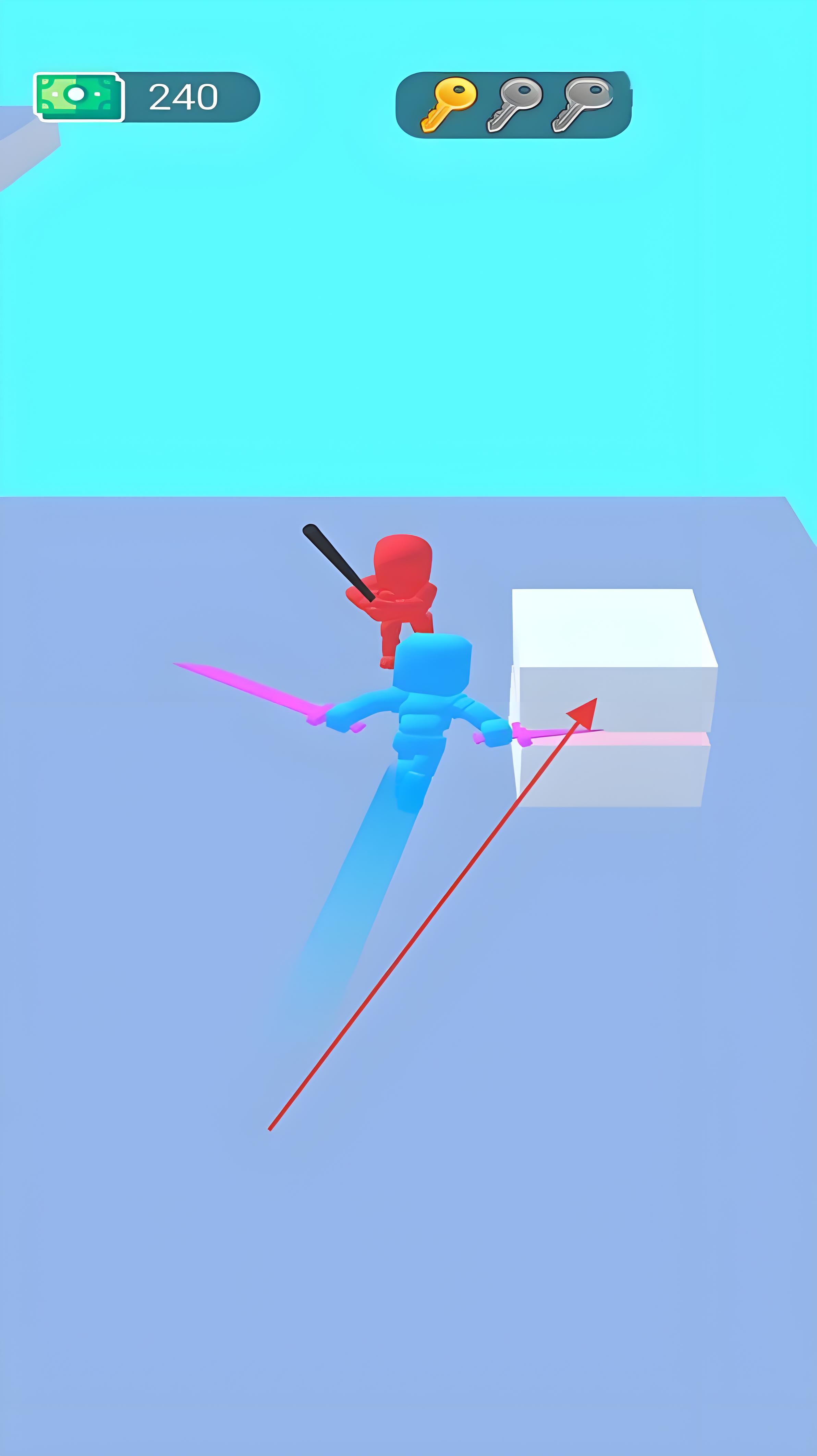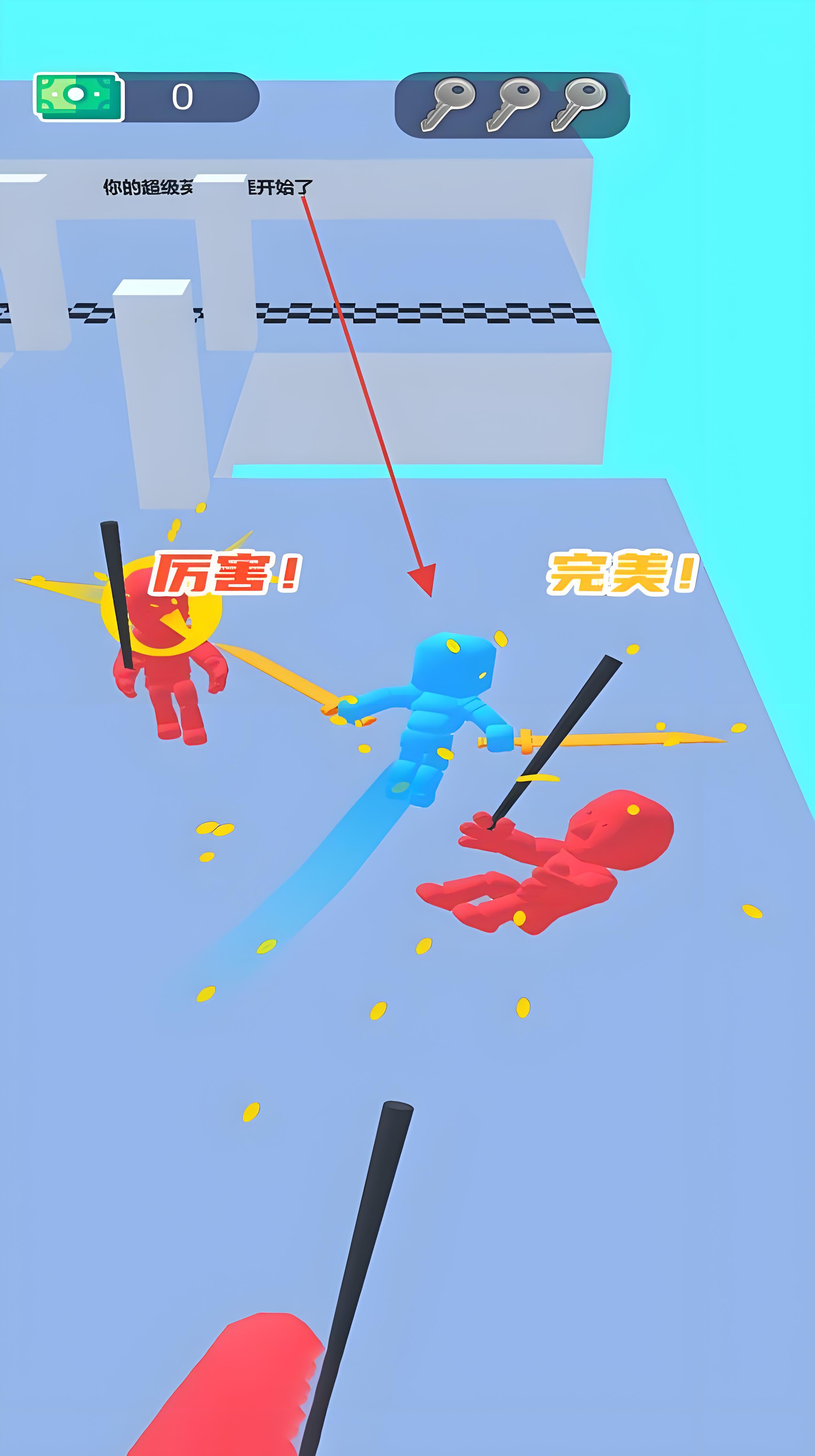 2、在关卡中,操控蓝色武士角色,利用手中的武器(如双剑)与红色敌人进行战斗通过滑动、点击等操作方式,释放攻击技能,击败敌人。