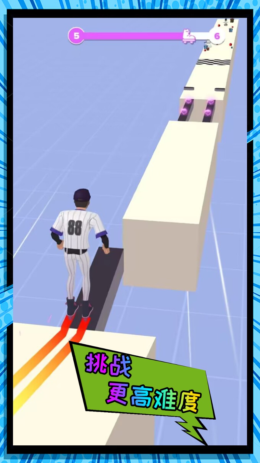 1、滑动操控闪避:左右拖动手指控制角色移动,避开赛道上的陷阱与障碍,同时控制双腿伸展跨越阻碍,考验手眼协调与反应速度。
