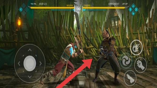3、两名角色正在对战,屏幕左下角是方向控制按钮,右侧是技能释放按钮,上方显示双方角色的血量条等信息。