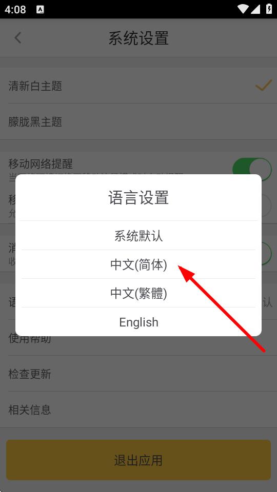 4、在弹出的语言设置选择框中,根据需求选择中文简体,即可完成语言设置选择。