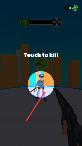 2、射击战斗:按“Touch to kill”指引,点击屏幕射击,消灭敌人推进关卡。