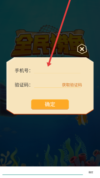 3、在登录弹窗,输入手机号,点击【获取验证码】,填入后点【确定】,完成登录,进入捕鱼游戏。