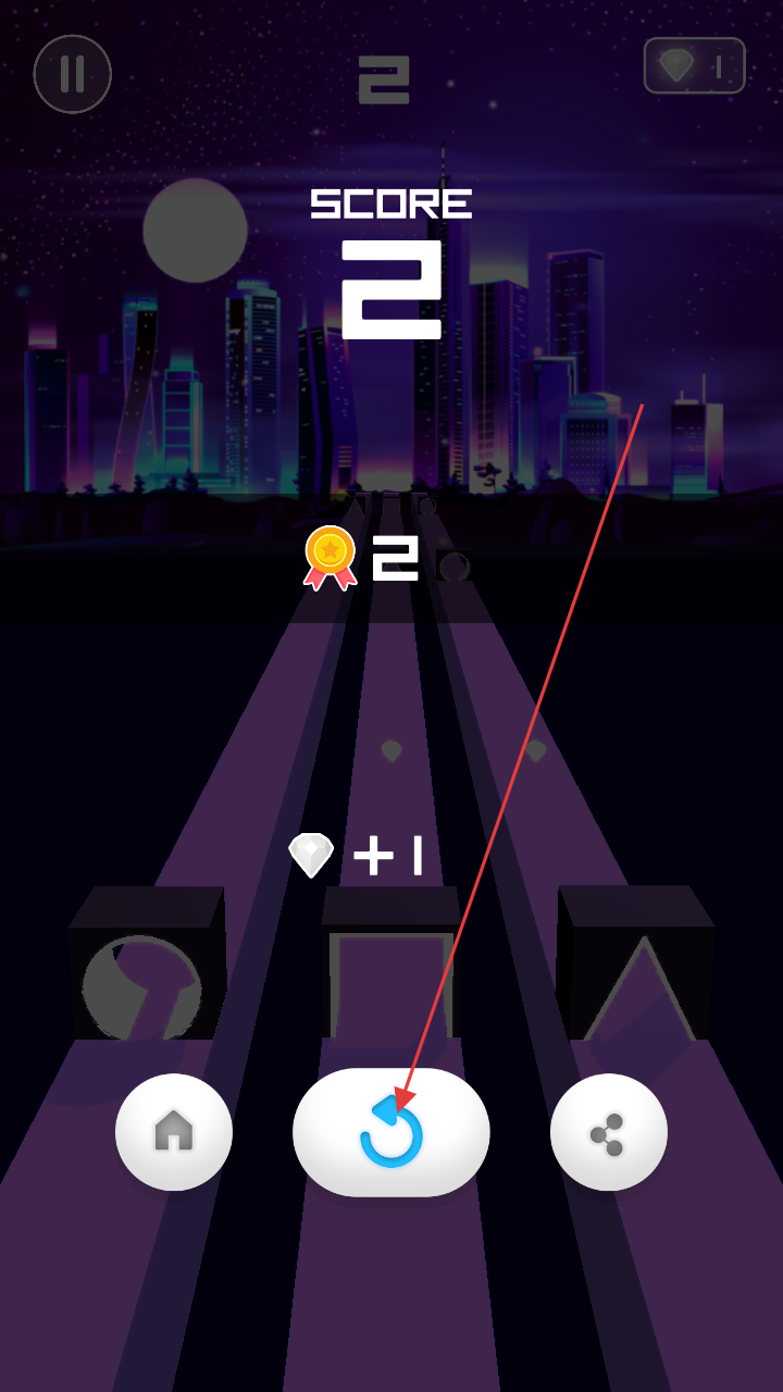 2、根据道路上出现的不同形状的障碍物(如三角形、正方形、圆形等),选择合适的时机点击按钮,让球体跳跃并通过障碍物。