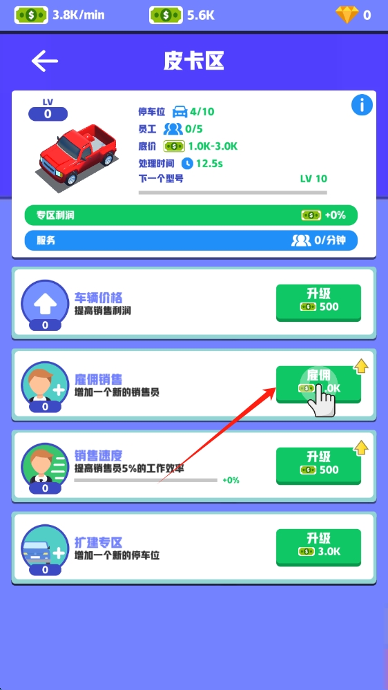 3、点击雇佣,收集特定组合的成就奖励解锁限定剧情,如"解锁所有基础场地""累计销售1000辆汽车"。