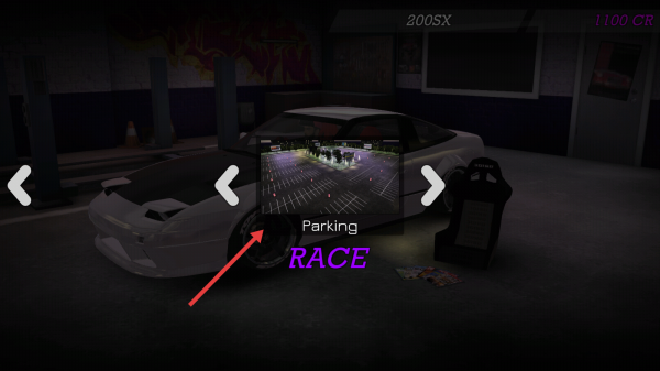 1、点击车库中【RACE】,选定“Parking”赛道,开白色赛车,启停车场地竞速。