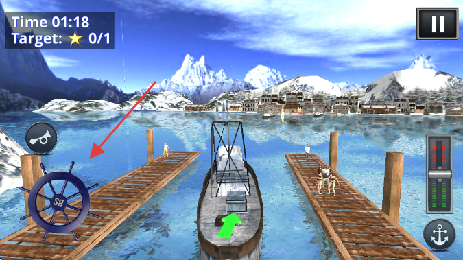 2、操控左侧船舵图标,调整船舶在码头间的行驶方向。