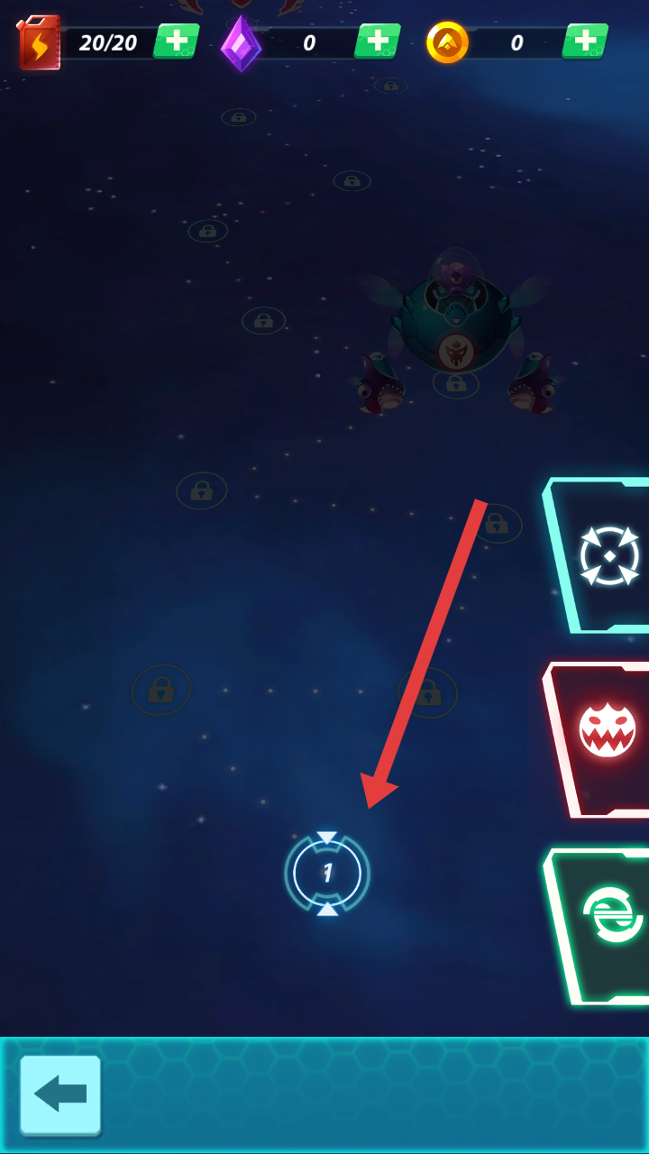 1、点击界面中央标有【1】的圆形按钮,进入游戏第一关卡,留意上方能量、紫晶、金币等资源栏状态,确认初始资源后,正式开启太空射击冒险之旅。
