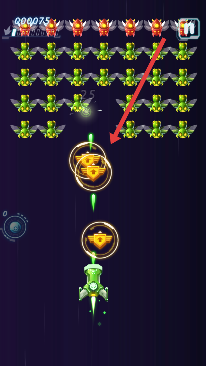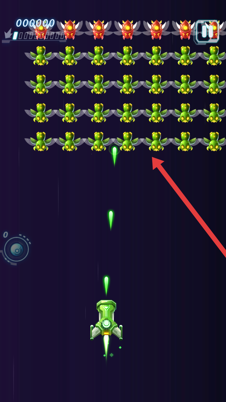 2、操控绿色飞船左右移动,发射绿色子弹攻击上方敌阵,优先清除前排绿色敌人,留意顶部红色精英敌人的攻击节奏,利用右上角暂停键灵活调整战斗策略。