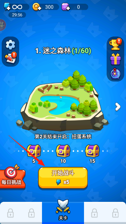1、在主界面,找到“开始战斗”按钮并点击,消耗5点蓝色道具,进入“迷之森林”第1关,开启冒险。