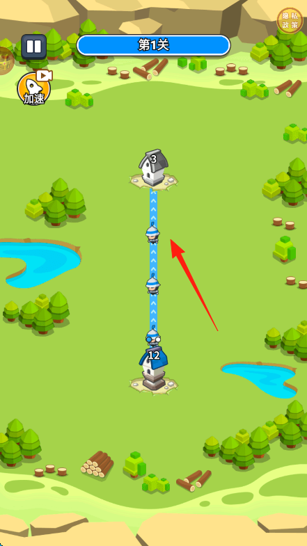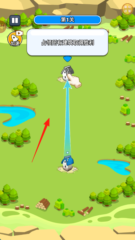 2、按提示,点击己方建筑(蓝色房子),向目标建筑(灰色房子)派遣兵力(箭头指向),占领建筑。
