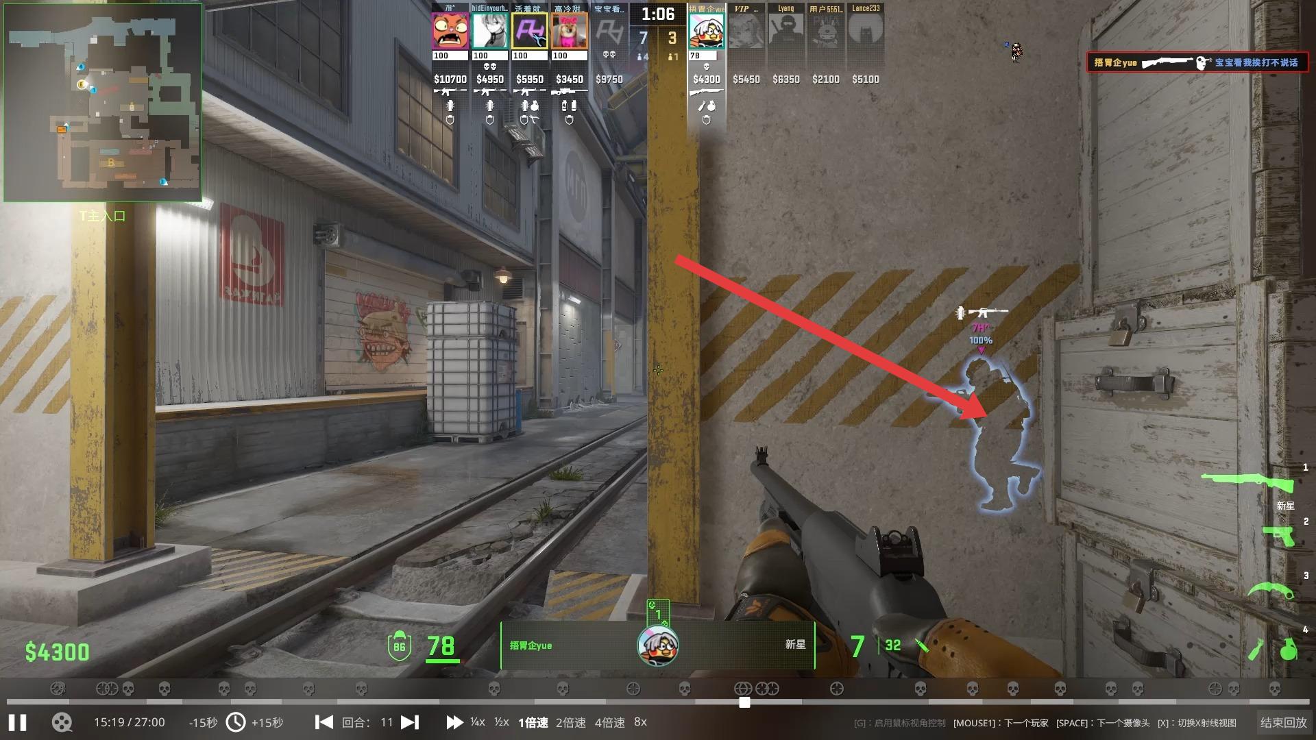 1、借助左上角小地图熟悉地形,牢记T主入口等关键点位、通道,方便转移和防守。