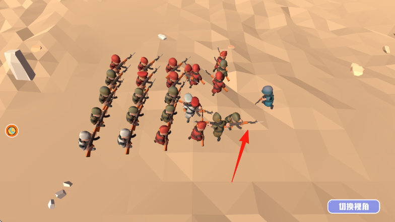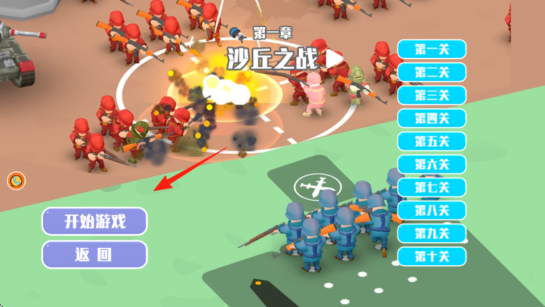 3、进入关卡后,拖动蓝色部队(箭头指向),调整阵型、进攻路线,对抗红色敌军,夺取胜利。