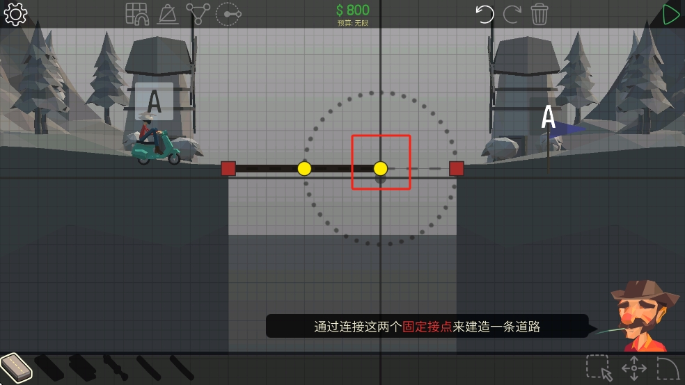 2、进入关卡后观察河流宽度和地形特点,查看可用材料清单,开始在脑海中构思桥梁的基本结构。