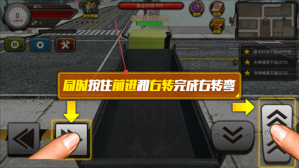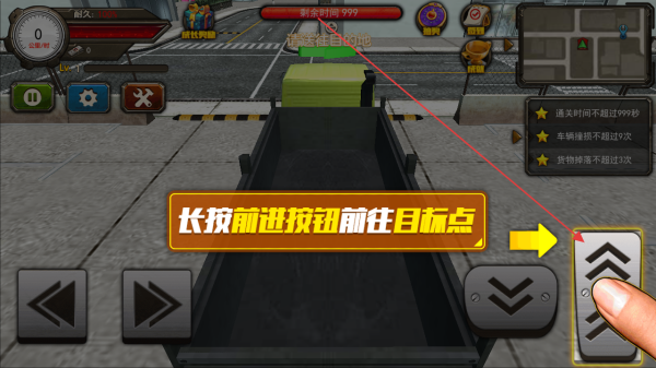 2、在游戏界面中,通过虚拟按钮控制卡车的移动长按前进按钮可使卡车向前行驶,前往目标地点在行驶过程中。