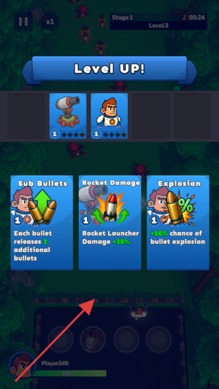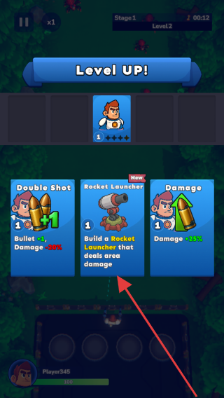 2、角色升级(【Level UP!】)后,如第二张图,出现技能升级选项,点击箭头所指的【Rocket Launcher】,可建造能造成范围伤害的火箭发射器,增强输出能力。