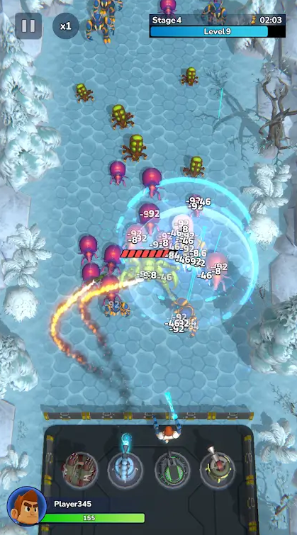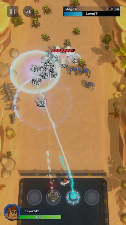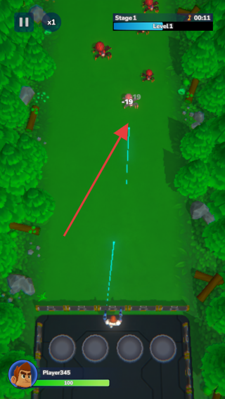 1、操控角色射击红色怪物,屏幕上方显示关卡【Stage 1】、剩余时间和等级【Level 1】,注意观察角色血量,不断攻击怪物积累经验。