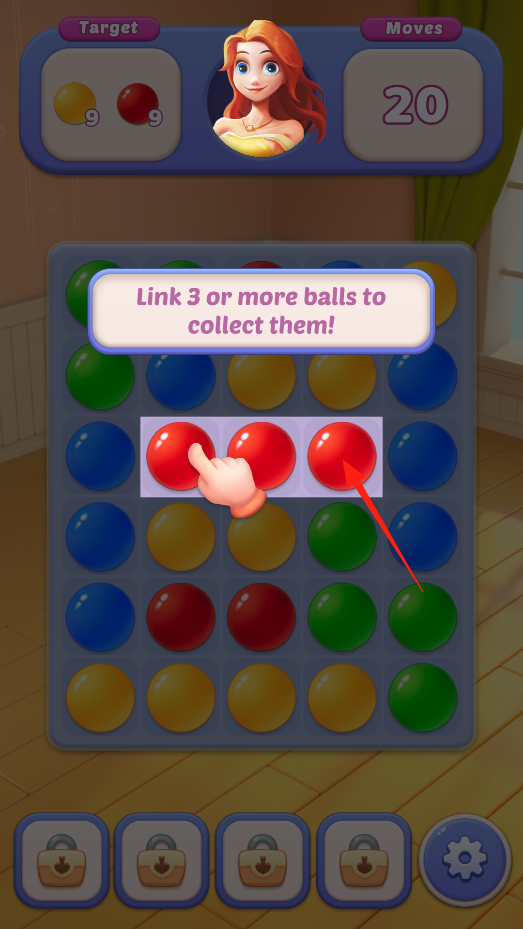 1、进入游戏关卡,按提示连接3个及以上同色球(如红色),借连线消除机制,首次尝试基础操作,完成目标计数(黄9、红9),消耗步数,开启彩球消除的策略体验。