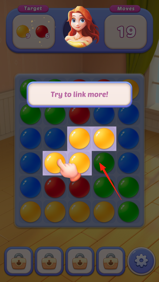 2、完成基础连线后,按“Try to link more!”指引,连接更多同色球(如黄色),借扩展消除机制,追求更高连消数,减少剩余目标,每一步优化连线策略,提升消除效率。