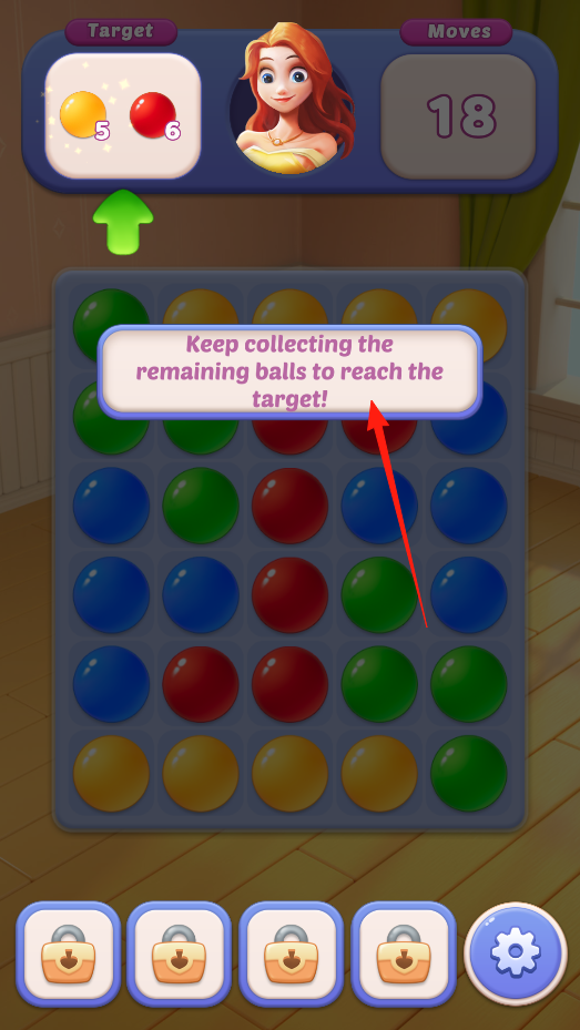3、剩余部分目标时,按提示“Keep collecting”继续连线,借目标推进机制,聚焦剩余黄、红球,合理规划步数,争取达成黄5、红6的最终目标,体验关卡收尾的策略挑战。