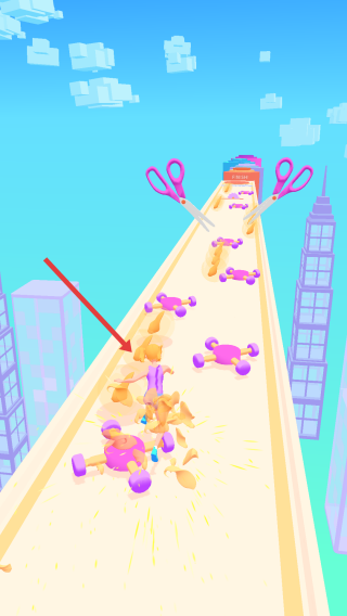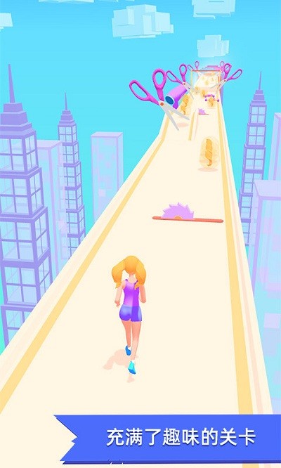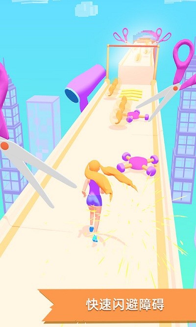 2、跑道上会出现粉色剪刀等障碍,要灵活调整角色位置,躲避剪刀,防止头发被剪断;若头发不幸被剪,角色会变小,需继续收集长发来恢复状态。