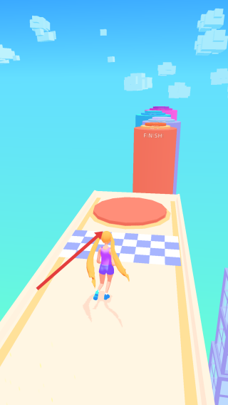 3、持续奔跑,躲避障碍,一路收集长发,成功抵达跑道尽头标有“FINISH”的终点区域,即可完成当前关卡,解锁后续更多充满挑战的跑酷关卡。