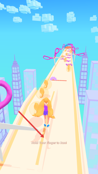 1、进入游戏关卡,按提示“Hold Your Finger to Run”,长按屏幕控制角色在跑道上开始奔跑,沿途收集金色长发,让角色的头发不断变长。