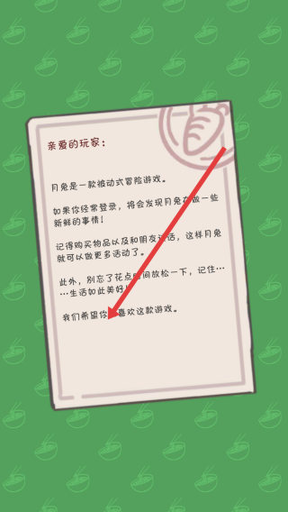 1、开局出现的是月兔冒险Tsuki Adventure给玩家的信件,介绍其为被动式冒险游戏,引导常登录。
