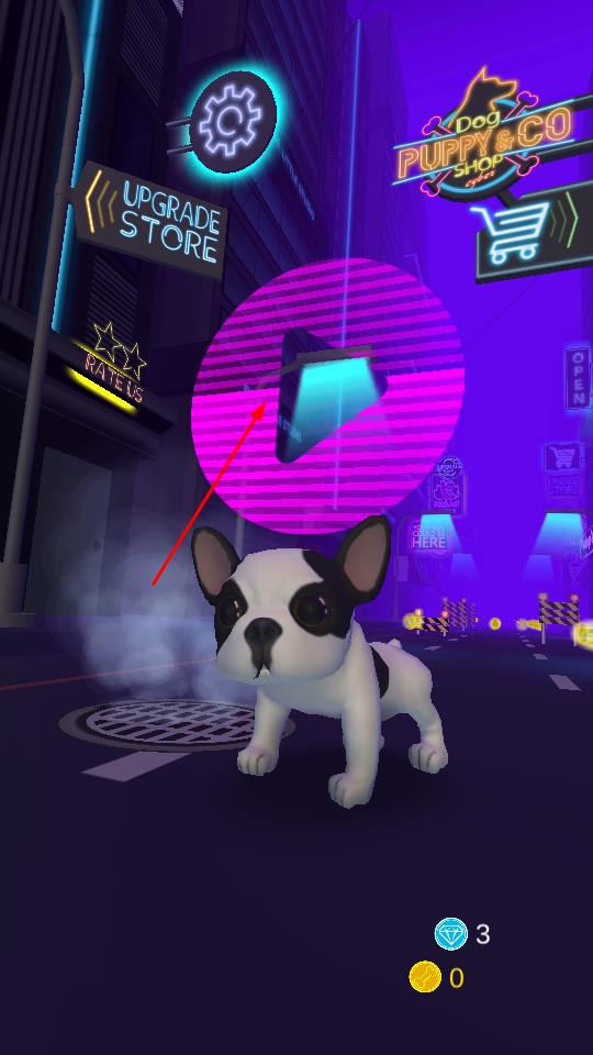 1、在初始界面,点击粉色圆形播放按钮,操控小狗开启跑酷之旅,可前往“UPGRADE STORE”等场景。