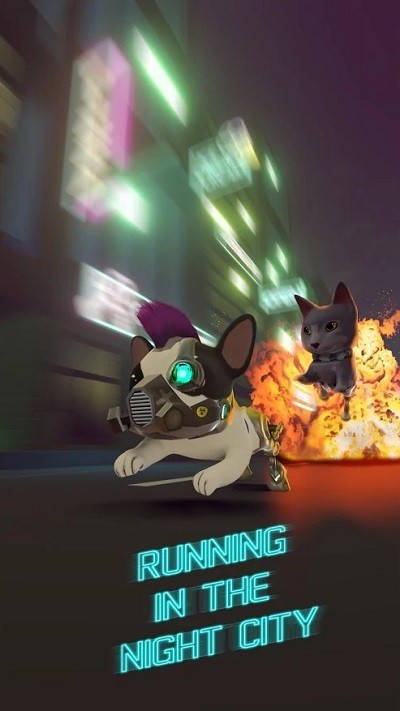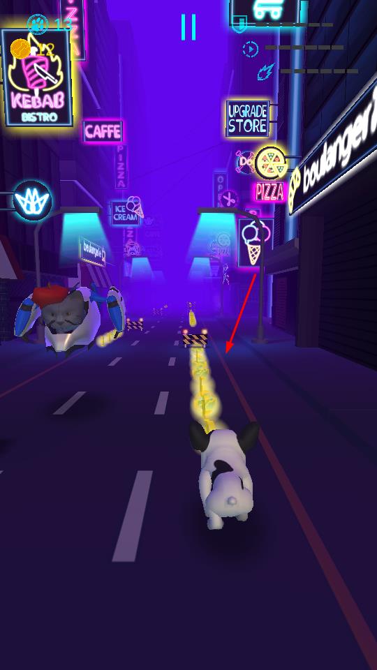 2、进入跑酷场景,引导小狗沿道路前行,躲避障碍,收集黄色道具,注意上方各类霓虹标识建筑。