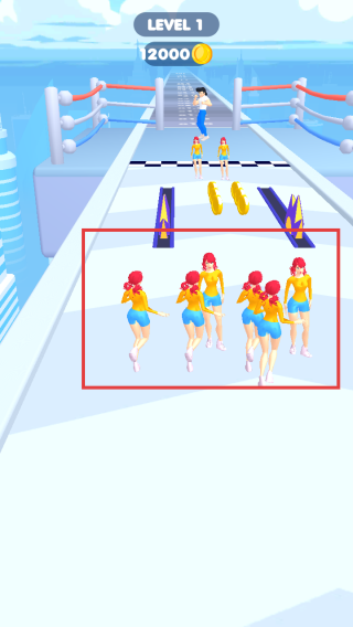 2、跑酷中,收集相同装扮角色(红框内),壮大队伍,避开尖刺等陷阱,向终点推进。