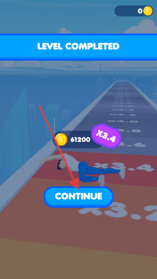 3、到达终点,显示【LEVEL COMPLETED】,点击【CONTINUE】,领取金币,进入下一关。