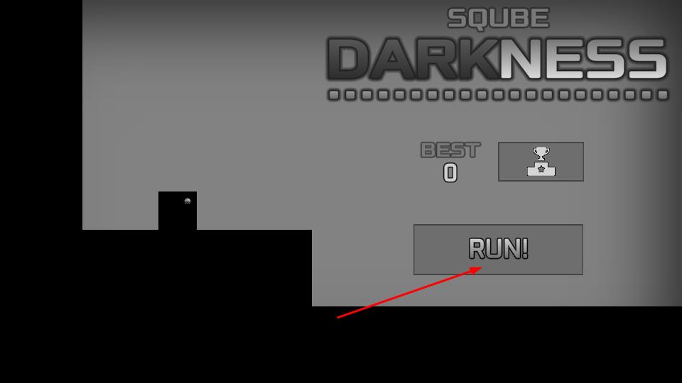 1、在初始界面,点击“RUN!”按钮,操控黑色方块开启黑暗跑酷挑战,目标是突破距离纪录。