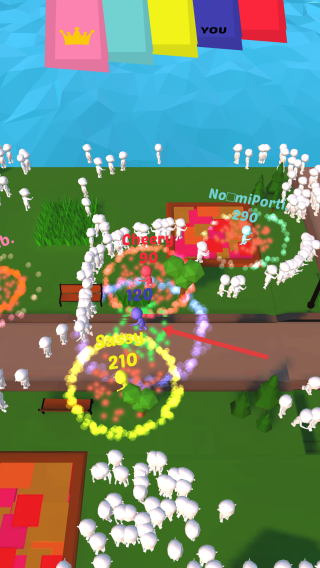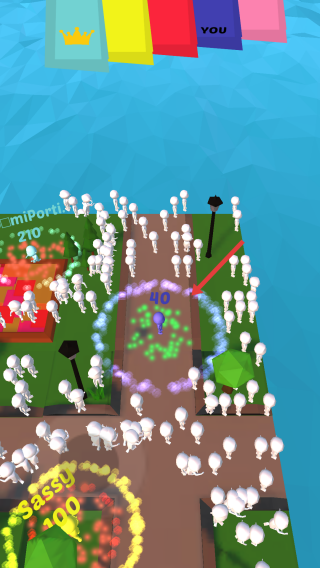 2、在地图中引导小人收集带数值(如+40、+210)的彩色光环,壮大队伍,同时争夺资源、应对其他玩家。