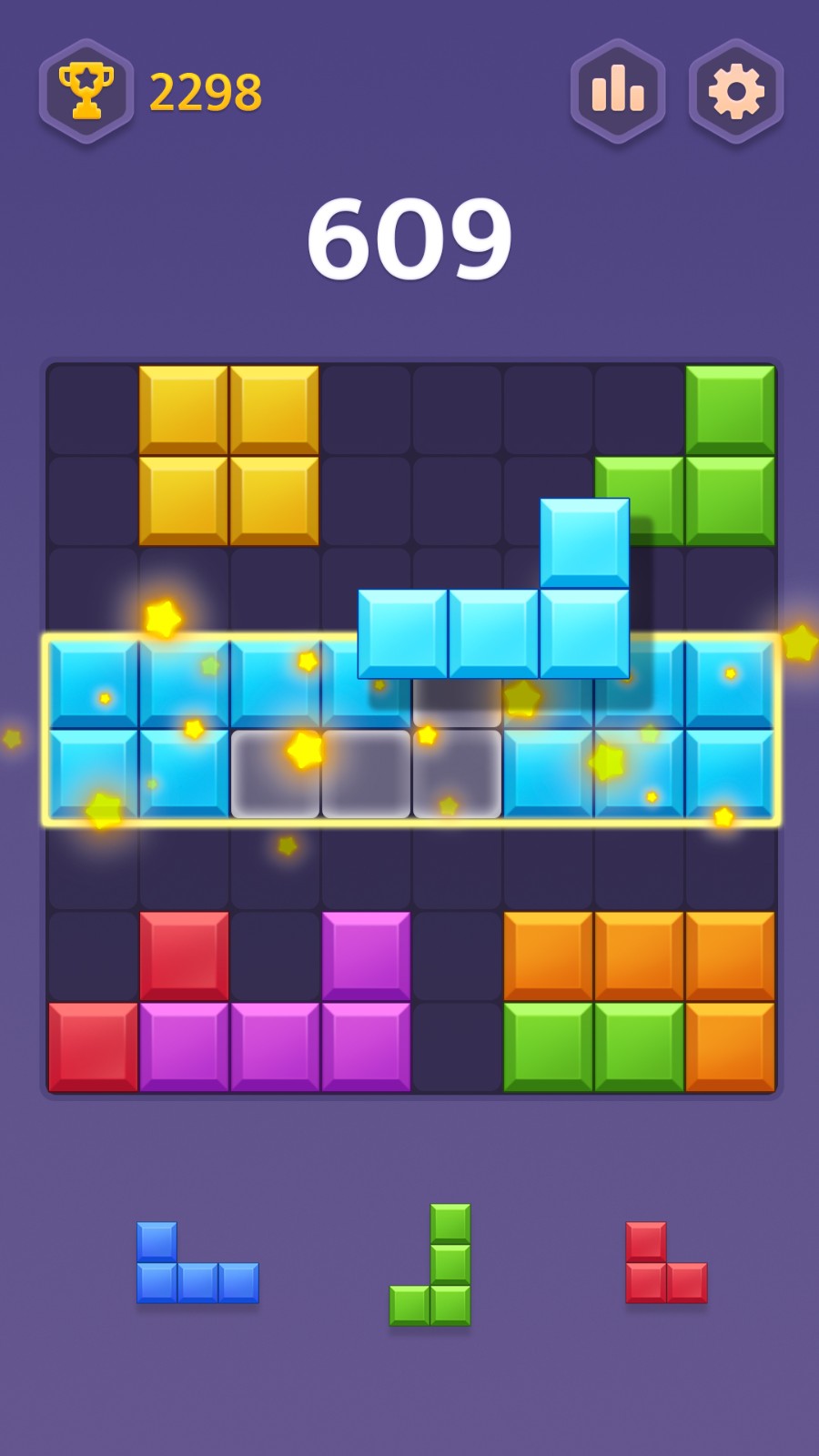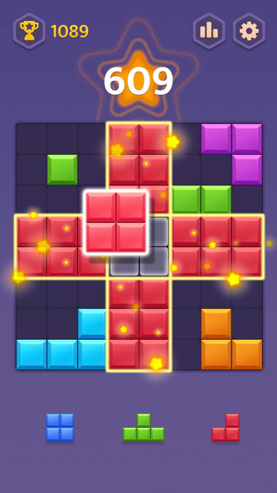 2、游戏进行中,有节奏地拖放彩色瓷砖排列,通过完成完整行列消除方块,尝试同时匹配多条线获取额外分数,规划后续方块位置。