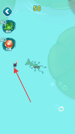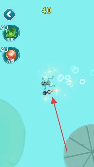 2、进入经典模式后,操控角色(如小蝌蚪)在水域场景移动,寻找相同等级的生物(如Lv.2青蛙),按照箭头方向移动,进行合成升级。