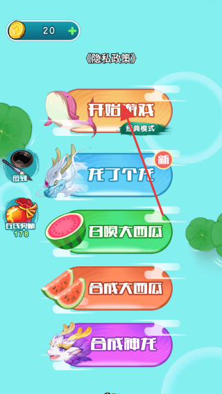 1、点击【开啦莉戎(经典模式)】,进入游戏,可选择“龙丁个龙”“召唤大西瓜”等模式,初始金币20。