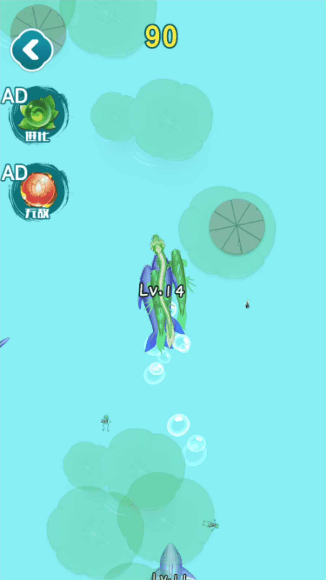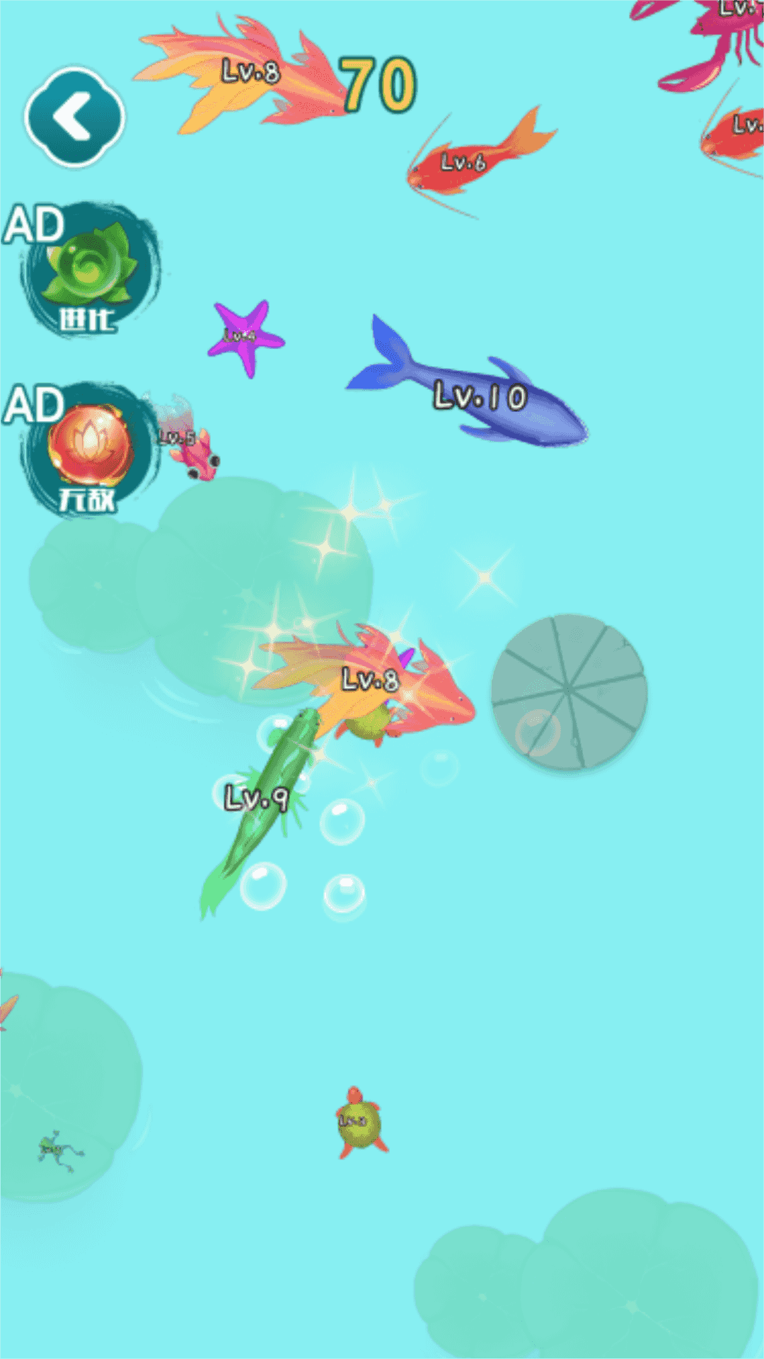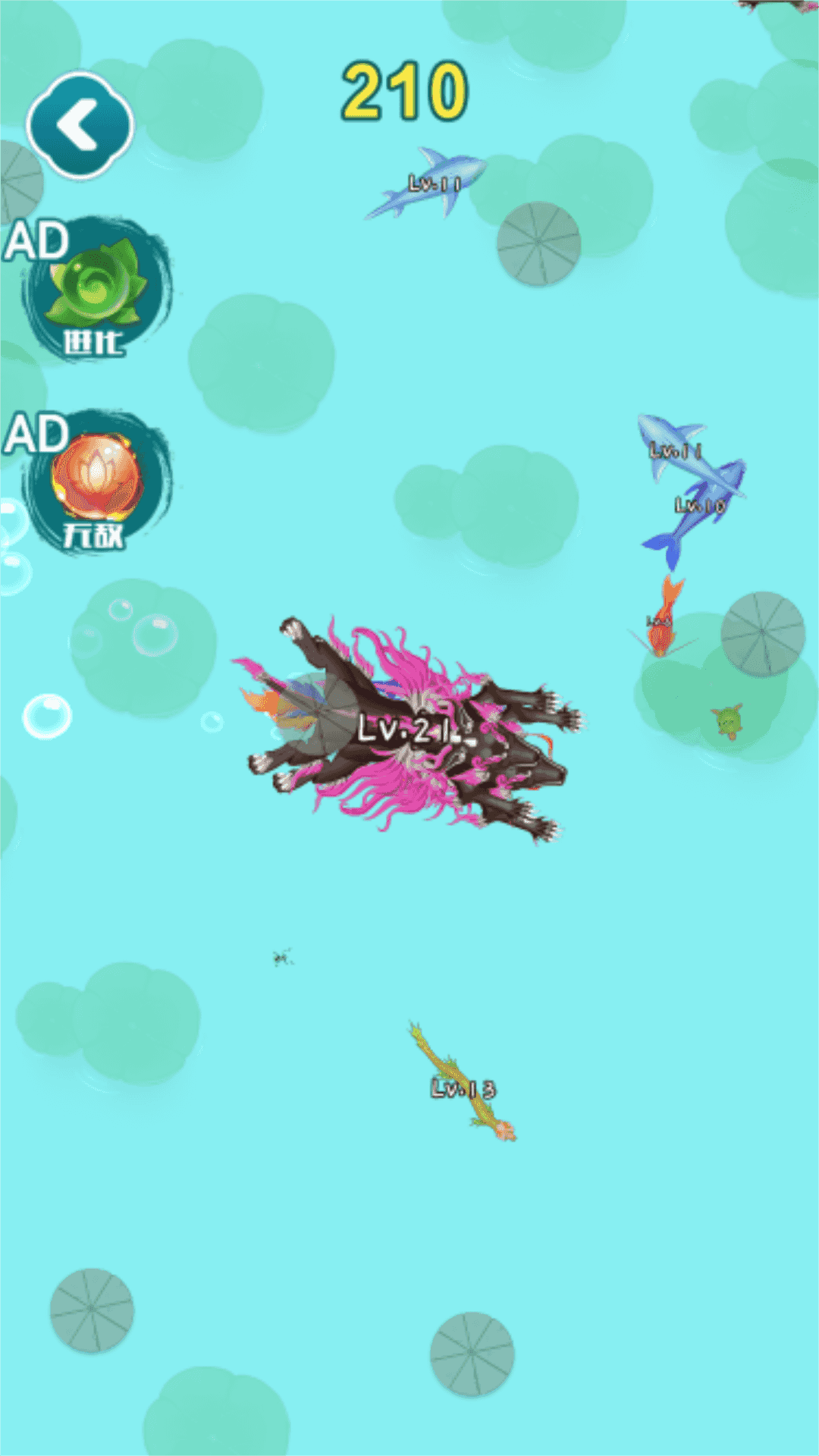 3、持续移动角色,让相同等级的生物碰撞合成,如将小蝌蚪与同类合成,逐步进化为更高级生物,注意利用“进化”“万能”等AD功能辅助,提升合成效率,推进游戏进程。